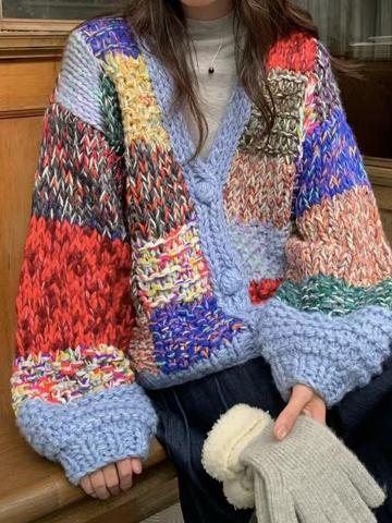 Maglione a trecce con bottoni a quadri e scollo a V