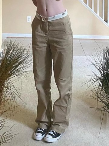 Design : vita alta, gamba dritta sottile, vita con risvolto con stampa a lettere
